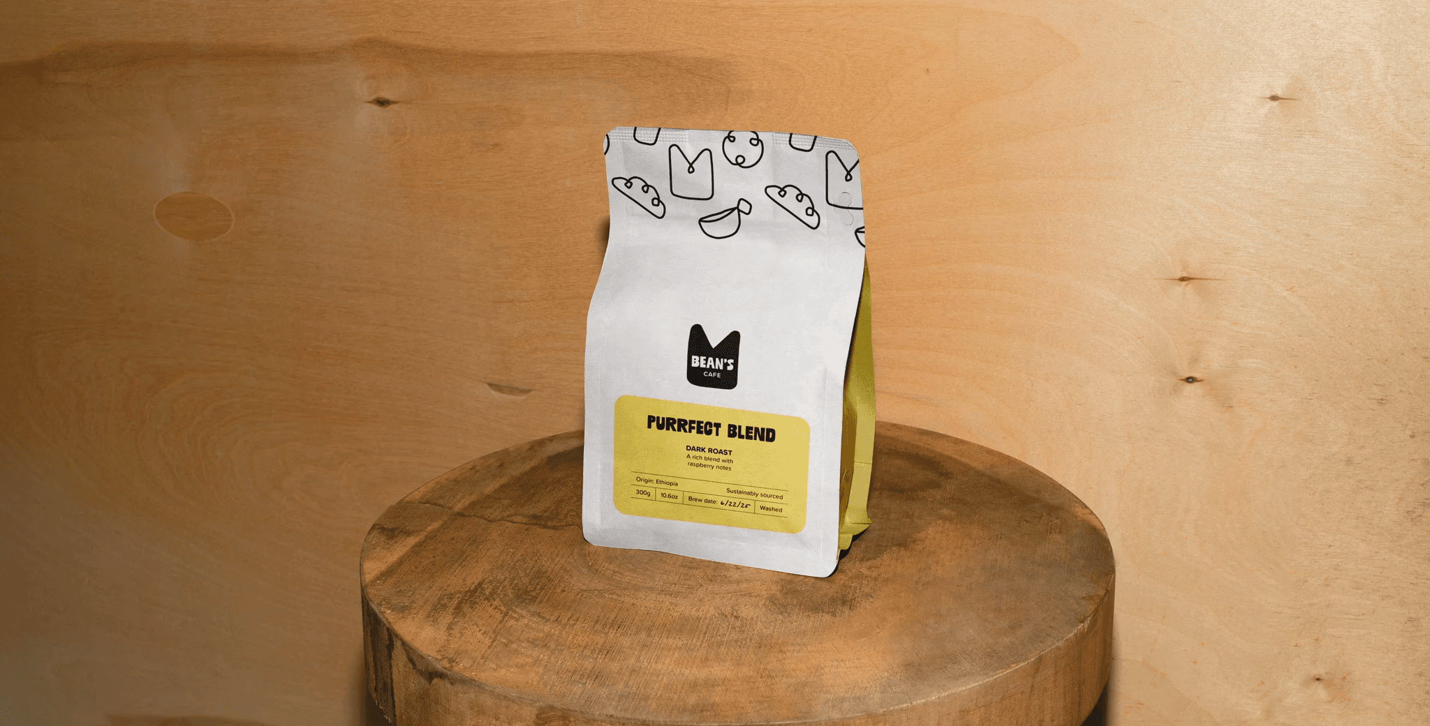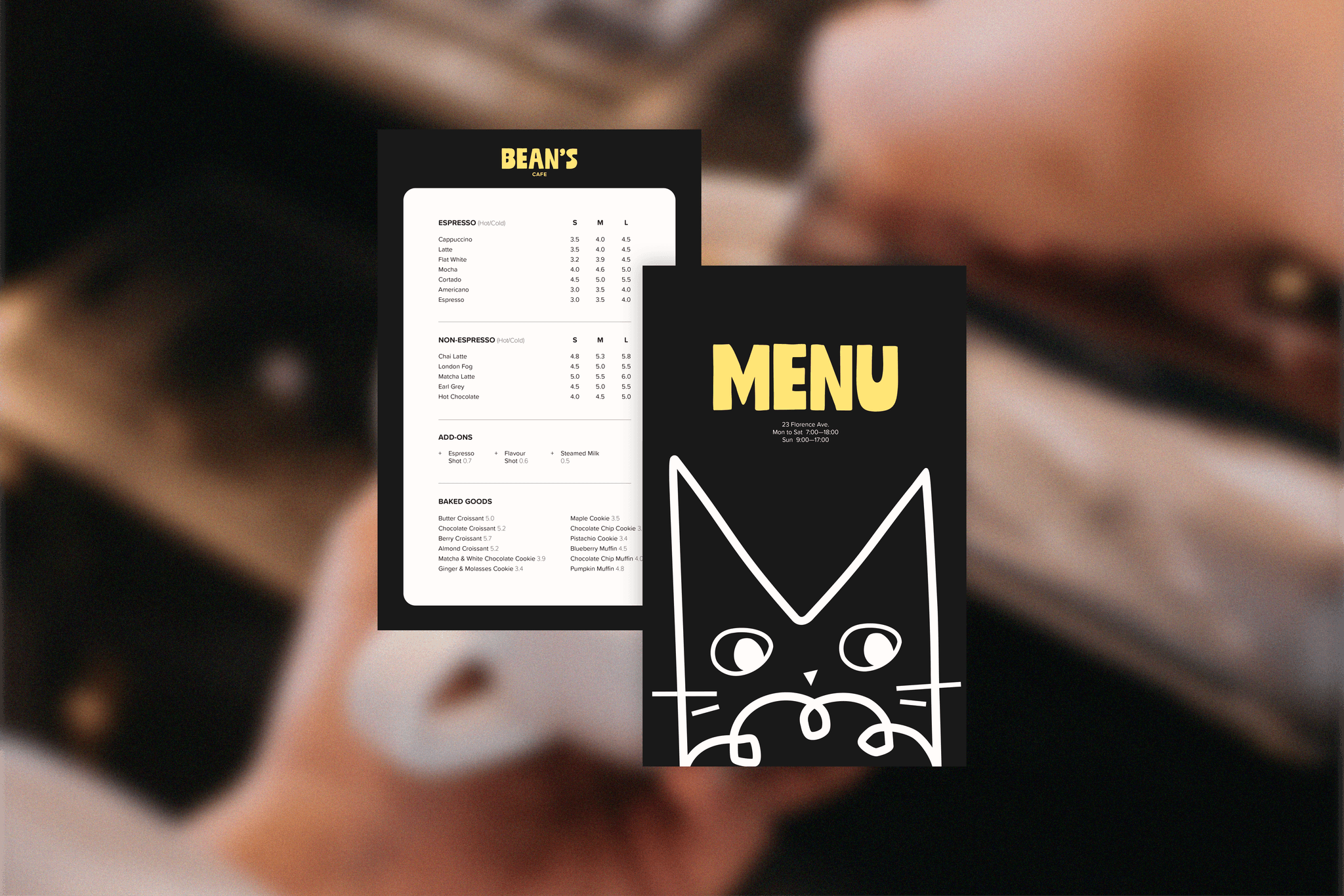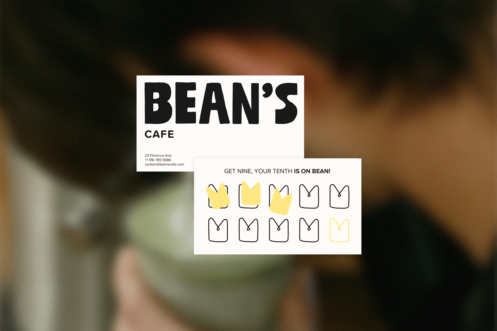 The name is a playful combination on coffee beans and the toe beans of animal paws. The logo catches Bean’s and his darting eyes ensuring no ones watching before he steals the goody, reflecting the mischievous character of our furry companions. Loose, playful, and imperfect illustrations with a soft yellow and warm imagery captures the casual and inviting environment of the space.