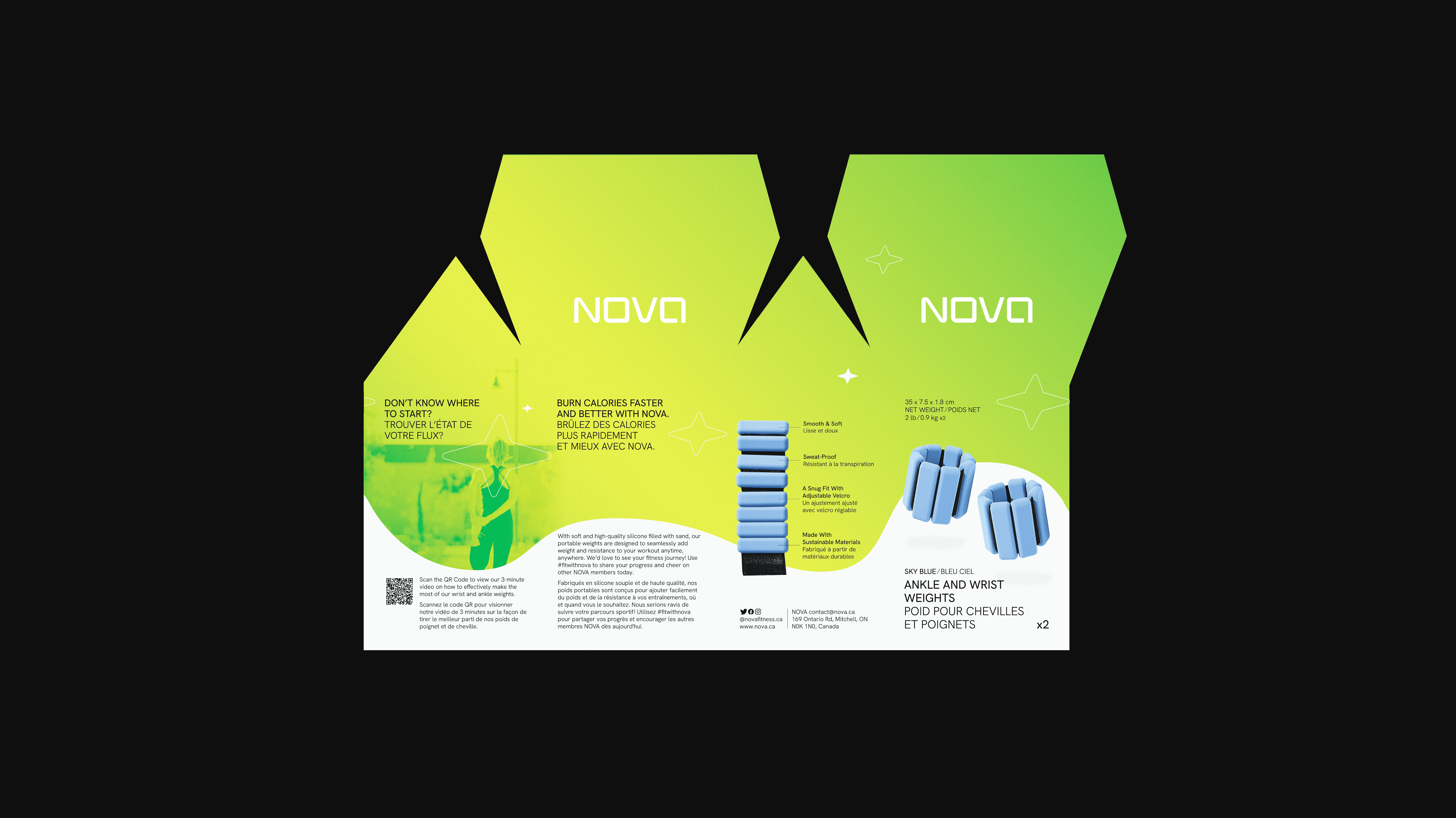 Short for “innovate” the brand is committed to providing quality portable fitness gear. Using sleek, star icons reflecting the meaning of nova, a star showing a sudden large increase in brightness, this brand provides their customers with a burst of motivation and encouragement to take on their fitness challenges and achieve their goals. Floating imagery combined with dynamic banding emphasizes the products lightweight portability. With QR codes to instructional workouts and copy that promotes their community, NOVA is dedicated to help all their customers from beginners to fitness-enthusiasts achieve a healthier, happier self.