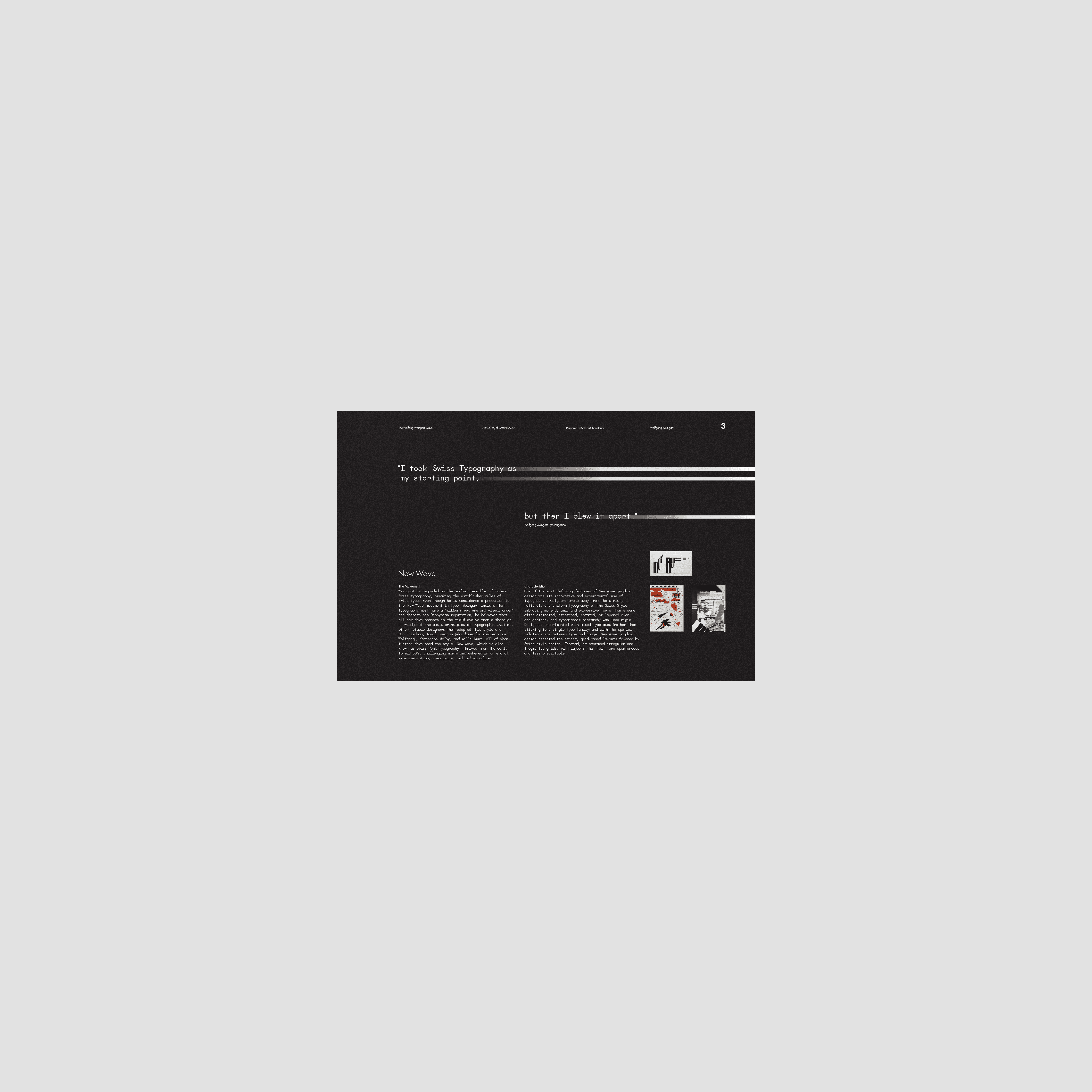 The name, The Wolfgang Weingart Wave reflects his contributions to pioneering the New Wave Swiss aesthetic, his work disrupted rules of Swiss type while still insisting that type should have a hidden and visual structure. The result is a cohesive yet flexible identity, compositions with clear hierarchy but with dynamic elements that aren’t solely confined to the grid. The design draws from elements commonly found throughout his work, such as charged lines, blocked text, fluctuating font weights, visible grid lines, and dramatic black and white compositions.